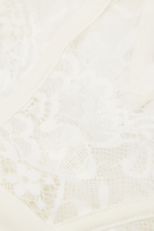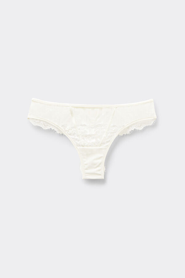 Brazilian kalhotky z řasové krajky s tylovými vložkami a měkkým lemováním z mikrovlákna. Zlobivý motiv na zadní straně. (175 cm) a má na sobě velikost 2 / s