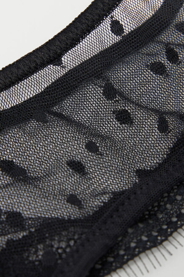 Brazilian kalhotky ze strečové krajky a puntíkovaného tylu. smyslný měkký elastický motiv zdobený zlatými cvočky, které se nosí vysoko v pase.