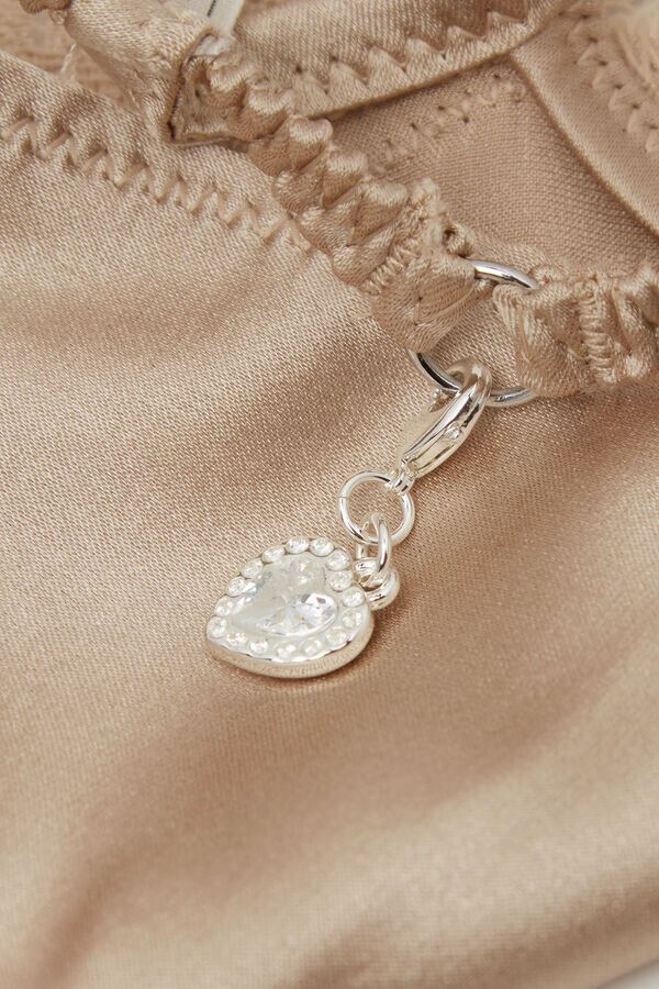 Thong z elastického hedvábného saténu zdobený romantickou květinovou vyšívanou krajkou. trojúhelníkový motiv na zadní straně zdobený přívěskem ve tvaru srdce s kamínky.