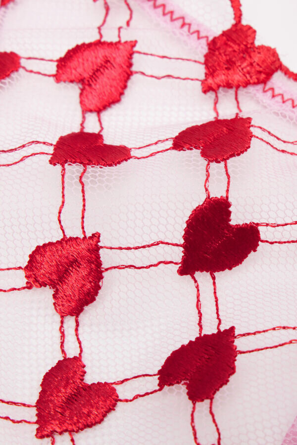 Thong z romantického tylu s vyšívaným srdíčkem a smyslnou saténovou lemovkou. saténový pásek je odnímatelný a lze jej použít také jako koketní náhrdelník nebo vlasový doplněk.