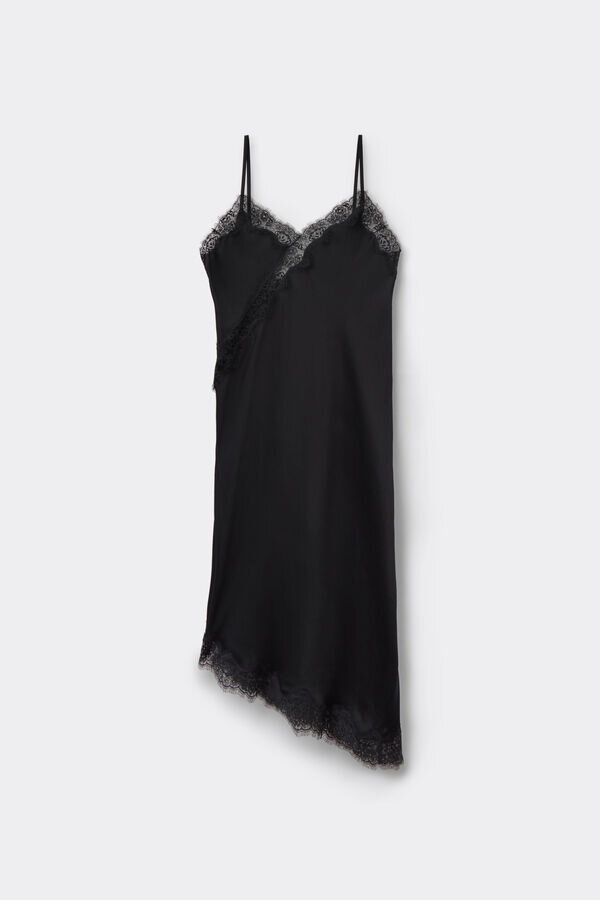 asymetrické spodní prádlo z viskózového saténu s krajkovými vložkami a lemováním. ideální také jako šaty pro ještě glamour styl. výstřih do V