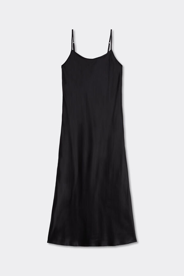 dlouhé, hladké hedvábné spodní prádlo s nastavitelnými tenkými ramínky a mírně zaobleným výstřihem. ideální pod dlouhé šaty pro elegantní siluetu nebo jako svrchní oděv doplněný nádhernými doplňky. Modelka měří 175 cm a má na sobě velikost S.