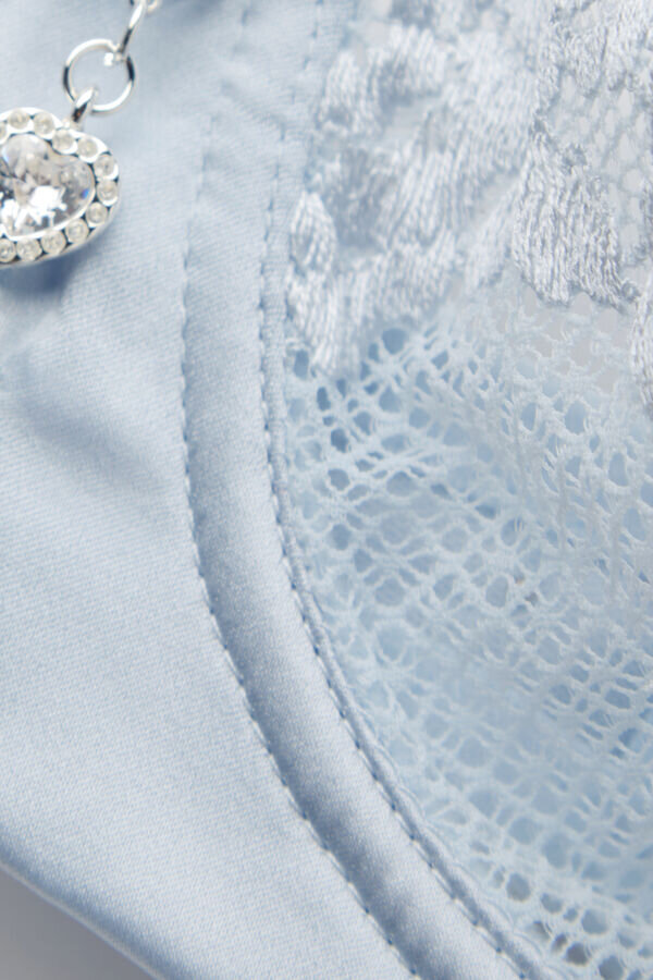 podprsenka Denise s balkónovým střihem, vyrobená z jemné elastické krajky s květinovou výšivkou a romantickým vroubkovaným lemem u výstřihu, který rámuje dekolt. Elegantní spodní lem z elastického hedvábného saténu s kosticemi ve tvaru V a krásným přívěskem ve tvaru srdce s kamínky uprostřed. Díky hlubokému výstřihu a košíčkům, které zvedají a zaoblují poprsí bez vycpávek, je to perfektní design pro zdůraznění dekoltu. Pohodlná a komfortní, vytváří velmi smyslný a zajímavý efekt i u menších poprsí.