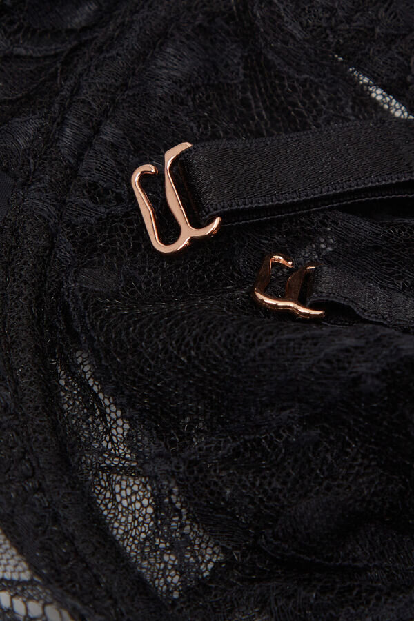 bandeau balconette podprsenka vyrobená z elegantní a smyslné květinové chantilly krajky. rafinovaný detail růžově zlatého doplňku uprostřed poprsí. ideální pro ty, které hledají smyslnou a ženskou bandeau podprsenku pro zvláštní příležitosti nebo jako alternativu k základní bandeau podprsence z mikrovlákna.