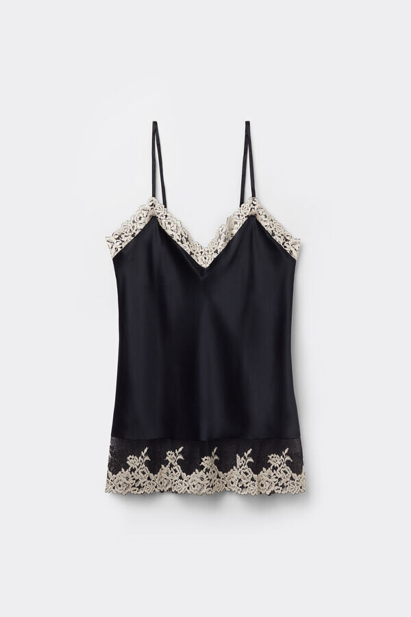 hedvábné saténové tílko s výstřihem do V vpředu i vzadu, zdobené krajkovými vložkami u výstřihu a na lemu. v závislosti na zvolené barvě může být krajka kontrastní nebo tón v tónu. plně nastavitelné tenké hedvábné ramínka. regular fit.