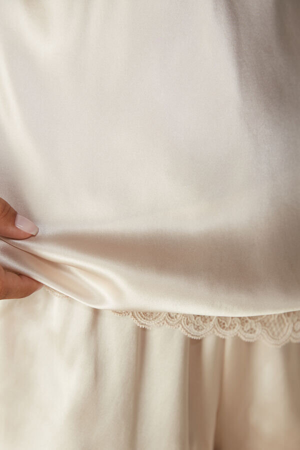 hedvábný top s výstřihem do V a nastavitelnými ramínky zdobený krajkovými detaily v oblasti výstřihu a lemu. ideální jako spodní prádlo i pod sako. Modelka měří 175 cm a má na sobě velikost S.