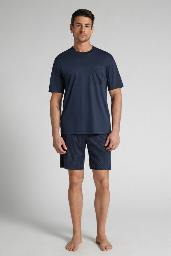 krátké pyžamo s měkkou jednobarevnou košilí z prémiové mercerované bavlny s kapsou s puntíkovaným vzorem. Šortky mají také puntíkovaný potisk.